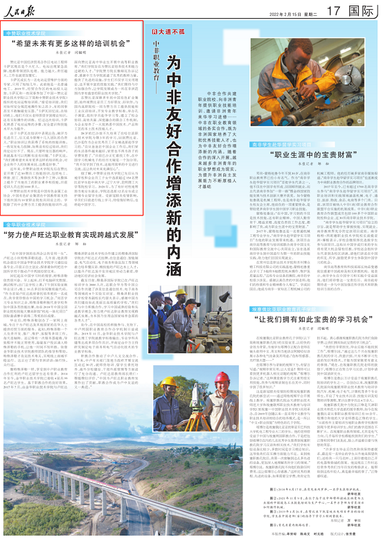 2022年2月15日出版的《人民日報》刊發(fā)題為《中非職業(yè)教育——為中非友好合作增添新的內涵(大道不孤)》文章,對中國有色集團推動我國職業(yè)教育“走出去”情況進行了報道(鏈接:http://paper.people.com.cn/rmrb/html/2022-02/15/nw.D110000renmrb_20220215_1-17.htm)。以下為報道全文: