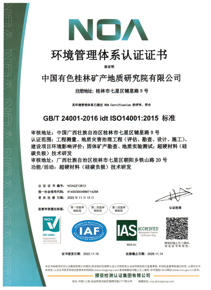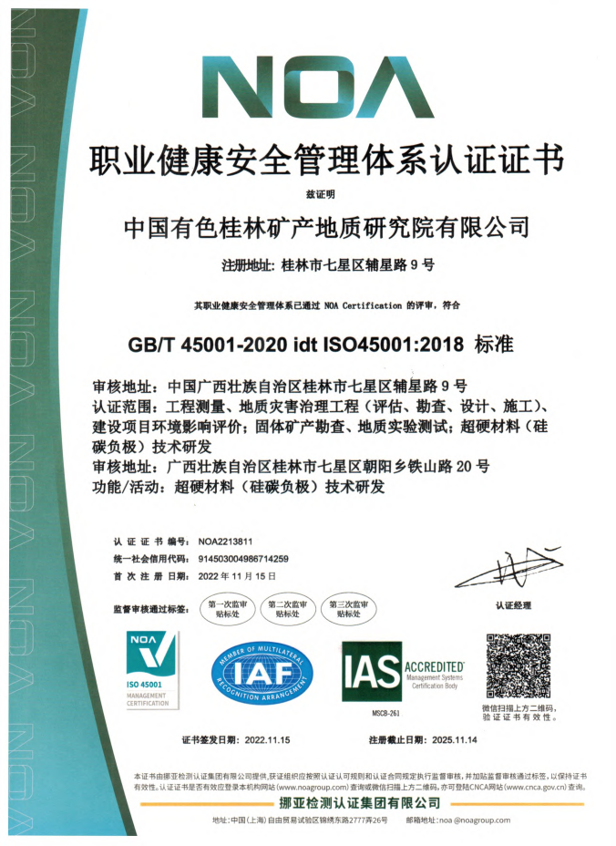 近日,中國有色桂林礦產(chǎn)地質(zhì)研究院有限公司(簡稱:中色桂林院)順利通過ISO14001環(huán)境管理體系及ISO45001職業(yè)健康安全管理體系認證審核,并取得體系認證證書,標志著中色桂林院在環(huán)境保護、員工職業(yè)健康安全、低碳經(jīng)濟等方面邁上新的臺階,企業(yè)全面規(guī)范化管理得到進一步強化與提升。